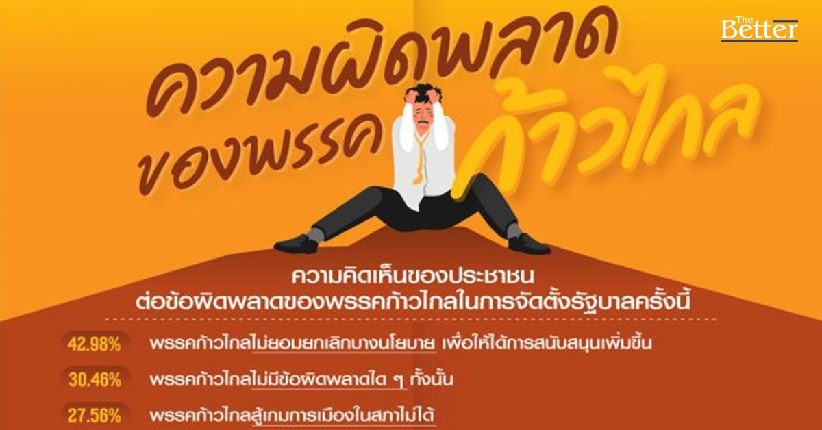 จากการสำรวจเมื่อถามถึงความคิดเห็นของประชาชนต่อข้อผิดพลาดของพรรคก้าวไกลในการจัดตั้งรัฐบาลครั้งนี้ พบว่า ตัวอย่าง ร้อยละ 42.98 ระบุว่า พรรคก้าวไกลไม่ยอมยกเลิกบางนโยบาย เพื่อให้ได้การสนับสนุนเพิ่มขึ้น รองลงมา ร้อยละ 30.46 ระบุว่า พรรคก้าวไกล ไม่มีข้อผิดพลาดใด ๆ ทั้งนั้น ร้อยละ 27.56 ระบุว่า พรรคก้าวไกลสู้เกมการเมืองในสภาไม่ได้ ร้อยละ 11.68 ระบุว่า พรรคก้าวไกลทำตัวปิดกั้นตัวเอง ทำให้ไม่ค่อยมีพันธมิตรทางการเมือง ร้อยละ 10.23 ระบุว่า พรรคก้าวไกลไม่เข้าใจวัฒนธรรมและความเป็นจริงทางการเมืองแบบไทย ๆ