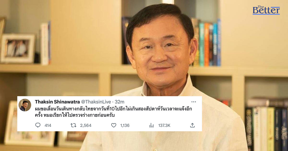 นายทักษิณ ชินวัตร ได้ทวิตขอความผ่านทวิตเตอร์ว่า “ผมขอเลื่อนวันเดินทางกลับไทยจากวันที่ 10 ไปอีกไม่เกินสองสัปดาห์ วันเวลาจะแจ้งอีกครั้ง หมอเรียกให้ไปตรวจร่างกายก่อนครับ”