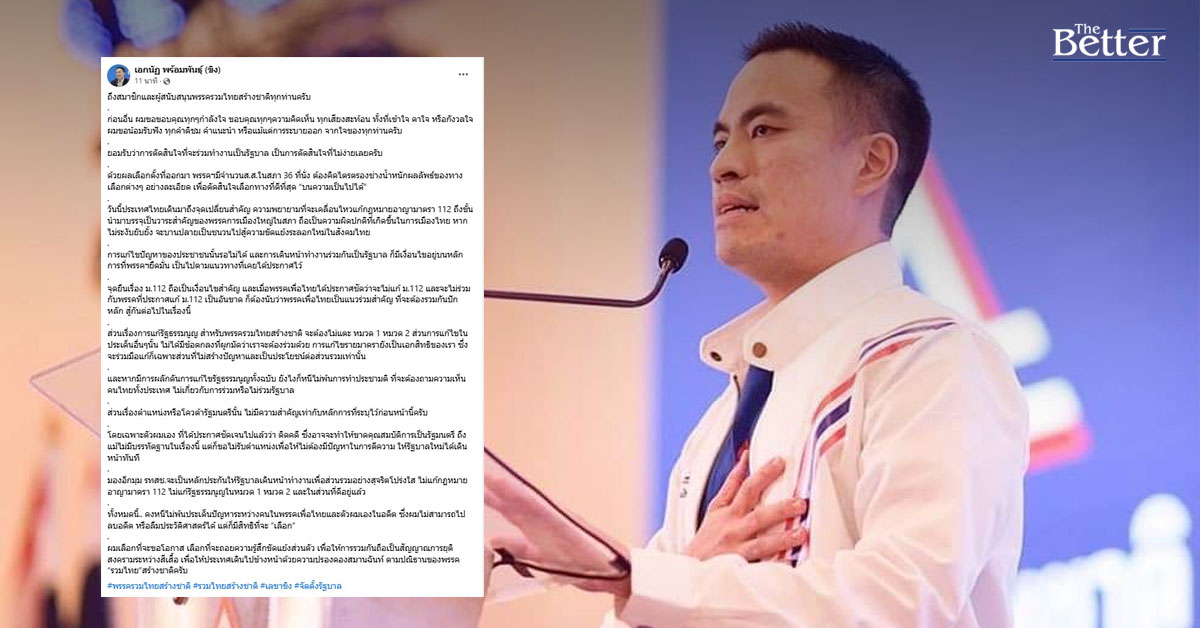 จุดยืนเรื่อง ม.112 ถือเป็นเงื่อนไขสำคัญ และเมื่อพรรคเพื่อไทยได้ประกาศชัดว่าจะไม่แก้ ม.112 และจะไม่ร่วมกับพรรคที่ประกาศแก้ ม.112 เป็นอันขาด ก็ต้องนับว่าพรรคเพื่อไทยเป็นแนวร่วมสำคัญ ที่จะต้องรวมกันปักหลัก สู้กันต่อไปในเรื่องนี้