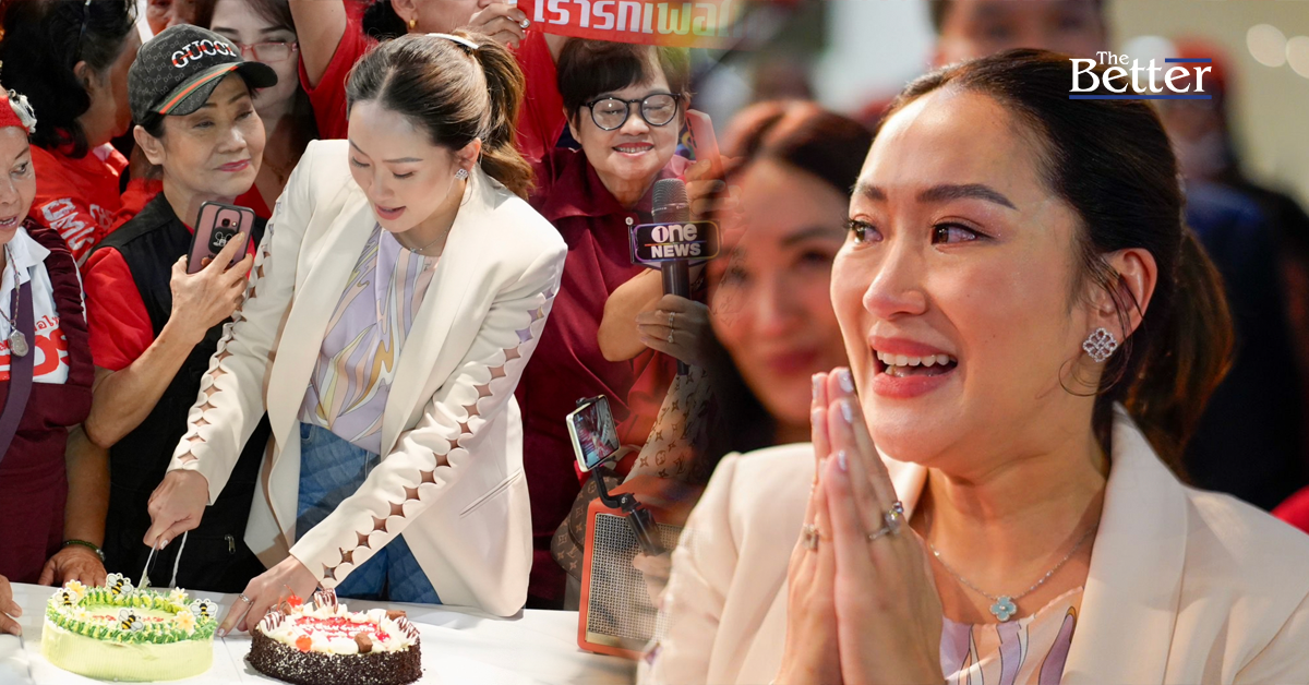 โดยตัวแทนได้มอบช่อดอกไม้สีแดงให้น.ส.แพทองธาร จากนั้น น.ส.แพทองธาร ได้เดินทางเข้าไปภายในร้าน ThinkLab ที่มีกลุ่มมวลชนเสื้อแดง รอมอบเค้กวันเกิด พร้อมร้องเพลงอวยพรวันเกิด และร้องเพลง “บ้านเรา” ต่อจากนั้นได้มีการส่งเสียงตะโกนว่า “รักทักษิณ” “รักเพื่อไทย” และ “รักอุ๊งอิ๊ง” ทำให้น.ส.แพทองธาร และน.ส.พินทองทา น้ำตาไหลทั้งคู่ด้วยความปลื้มใจ