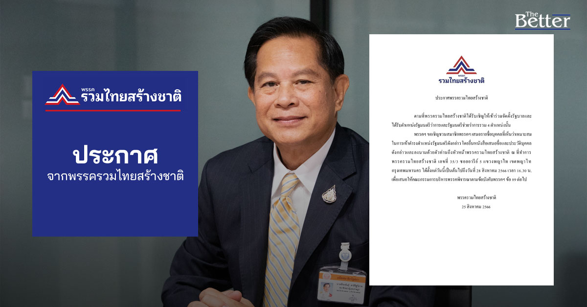 พรรคฯ ขอเชิญชวนสมาชิกพรรคฯ เสนอรายชื่อบุคคลที่เห็นว่าเหมาะสมในการเข้าดำรงตำแหน่งรัฐมนตรีดังกล่าว โดยยื่นหนังสือเสนอชื่อและประวัติบุคคลดังกล่าวและลงนามด้วยตัวท่านถึงหัวหน้าพรรครวมไทยสร้างชาติ ณ ที่ทำการพรรครวมไทยสร้างชาติ เลขที่ 35/3 ซอยอารีย์ 5 แขวงพญาไท เขตพญาไท กรุงเทพมหานคร ได้ตั้งแต่วันนี้เป็นต้นไปถึงวันที่ 28 สิงหาคม 2566 เวลา 16.30 น. เพื่อเสนอให้คณะกรรมการบริหารพรรคพิจารณาตามข้อบังคับพรรคฯ ข้อ 89 ต่อไป