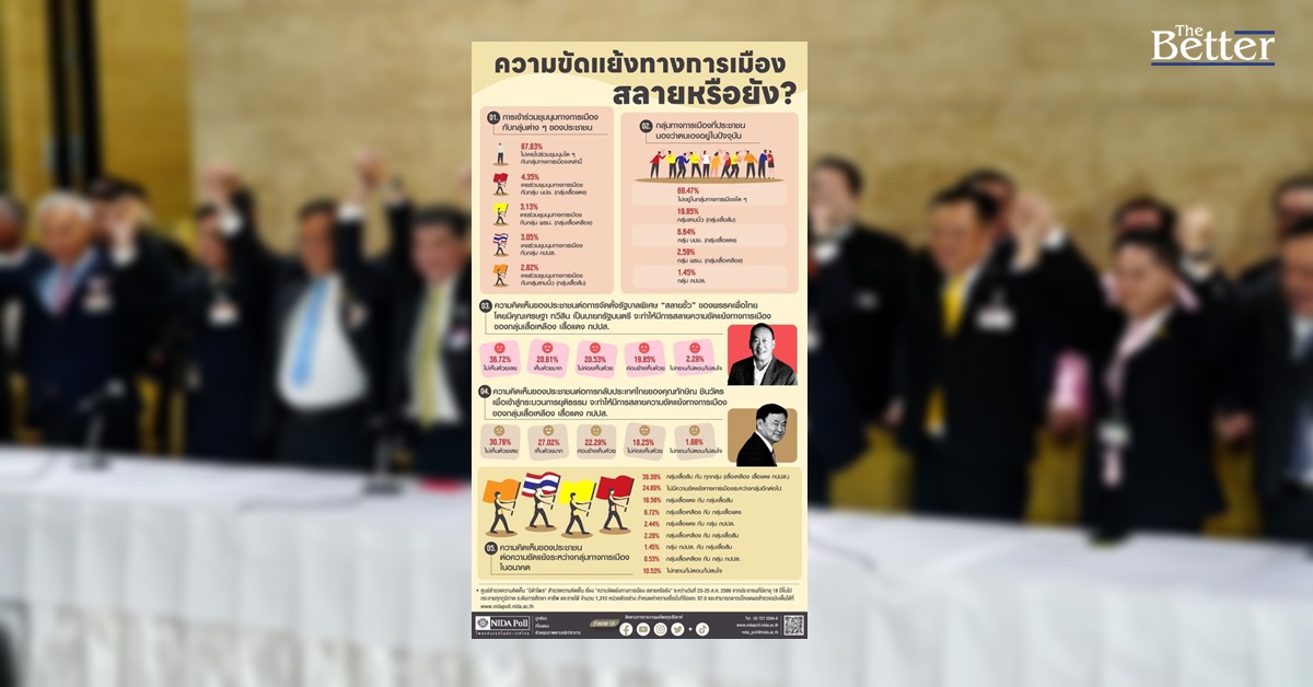 ศูนย์สำรวจความคิดเห็น “นิด้าโพล” สถาบันบัณฑิตพัฒนบริหารศาสตร์ (นิด้า) เผยผลสำรวจของประชาชน เรื่อง “ความขัดแย้งทางการเมือง สลายหรือยัง?” ทำการสำรวจระหว่างวันที่ 23-25 สิงหาคม 2566 จากประชาชนที่มีอายุ 18 ปีขึ้นไป กระจายทุกภูมิภาค ระดับการศึกษา อาชีพ และรายได้ ทั่วประเทศ รวมทั้งสิ้น จำนวน 1,310 หน่วยตัวอย่าง เกี่ยวกับความขัดแย้งทางการเมือง การสำรวจอาศัยการสุ่มตัวอย่าง โดยใช้ความน่าจะเป็นจากบัญชีรายชื่อฐานข้อมูลตัวอย่างหลัก (Master Sample) ของ “นิด้าโพล” สุ่มตัวอย่างด้วยวิธีแบบง่าย (Simple Random Sampling) เก็บข้อมูลด้วยวิธีการสัมภาษณ์ทางโทรศัพท์ โดยกำหนดค่าความเชื่อมั่น ร้อยละ 97.0