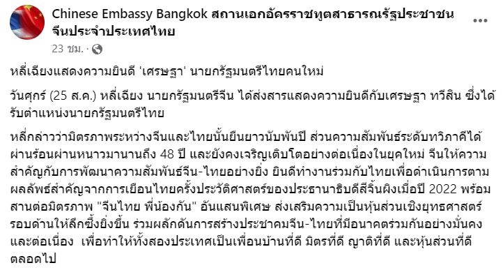 สถานเอกอัครราชทูตสาธารณรัฐประชาชนจีนประจำประเทศไทย เผยแพร่แถลงการณ์ของนายหวัง เหวินปิน โฆษกกระทรวงการต่างประเทศจีน ใจความว่า ขอแสดงความยินดีต่อ “คุณเศรษฐา ทวีสิน” ที่ได้รับเลือกตั้งเป็นนายกรัฐมนตรีคนใหม่ของไทย จีนและไทยมีความใกล้ชิดเหมือนครอบครัวเดียวกัน เราพร้อมที่จะทำงานร่วมกับไทยเพื่อให้ประชาชนของเราเป็นเพื่อนบ้านที่ดี มิตรสหายที่ดี ญาติสนิทที่ดี และพันธมิตรที่ดีตลอดไป