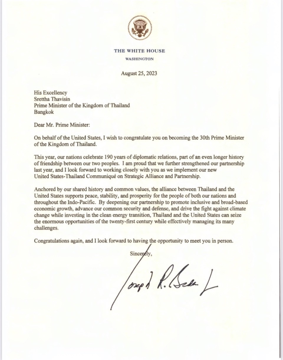 ทำเนียบรัฐบาลเผย สหรัฐ-จีน และผู้นำนานาชาติ ส่งสารแสดงความยินดี “เศรษฐา” รับตำแหน่งนายกฯ “ผู้นำสหรัฐ-จีน