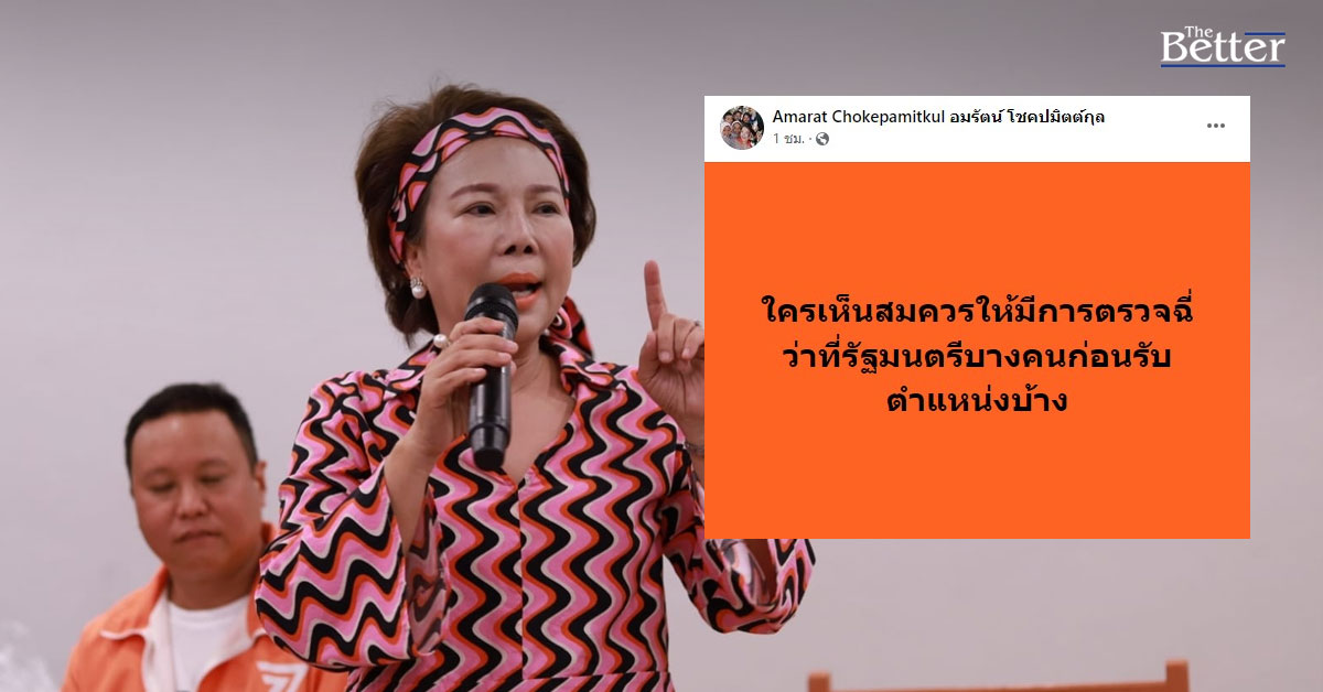 นางอมรัตน์ โชคปมิตต์กุล หรือ เจี๊ยบ อดีต ส.ส.ก้าวไกล โพสต์ข้อความลงเฟซบุ๊ก Amarat Chokepamitkul อมรัตน์ โชคปมิตต์กุล ระบุ ใครเห็นสมควรให้มีการตรวจฉี่ ว่าที่รัฐมนตรีบางคนก่อนรับตำแหน่งบ้าง