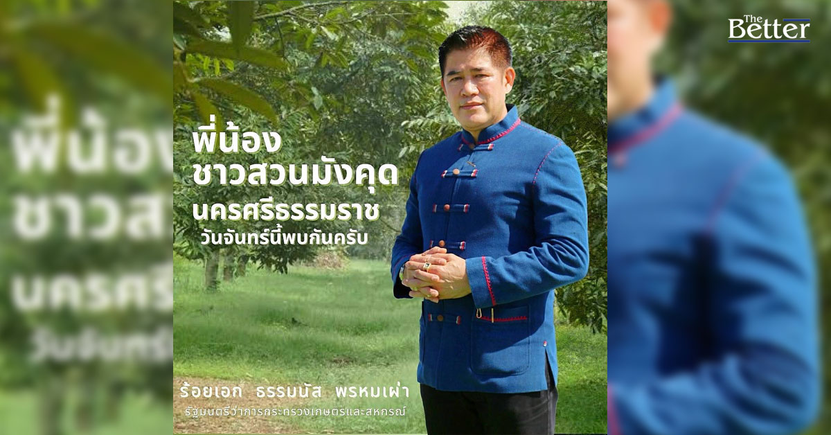 ร.อ.ธรรมนัส พรหมเผ่า รัฐมนตรีว่าการกระทรวงเกษตรและสหกรณ์ โพสต์ภาพข้อความผ่านเฟซบุ๊กว่า พี่น้องชาวสวนมังคุดนครศรีธรรมราช วันจันทร์นี้พบกันครับ