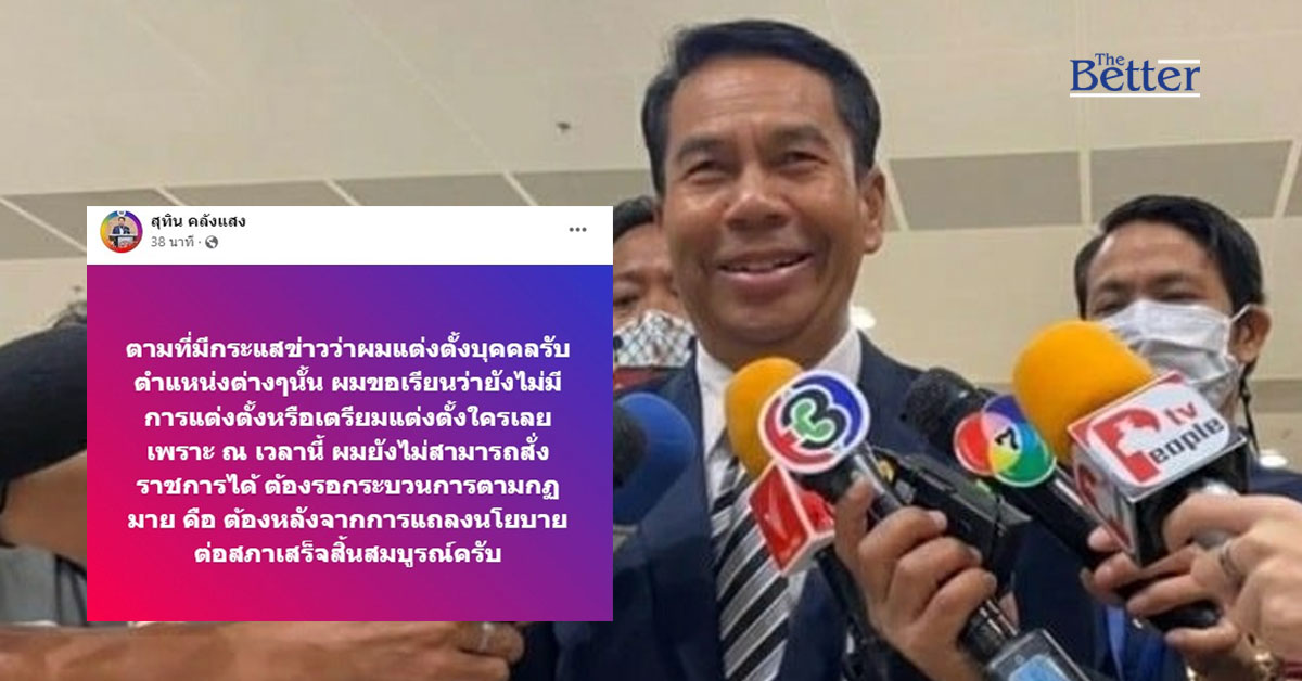 "สุทิน"โพสต์แจงยังไม่ตั้งใครเป็นทีมทำงานตอนนี้ รอแถลงนโยบายรัฐบาลต่อสภาก่อน
