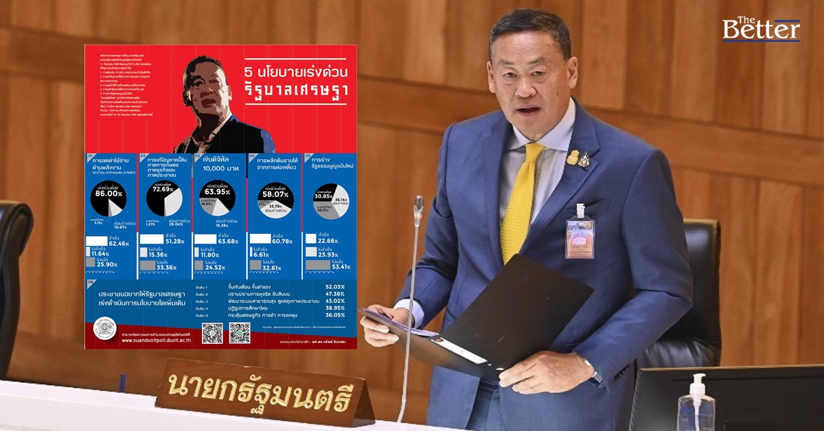 ความคิดเห็นของประชาชนต่อ 5 นโยบายเร่งด่วนของรัฐบาลเศรษฐา ในนโยบายการลดค่าใช้จ่ายด้านพลังงาน (ค่าน้ำมัน ค่าก๊าซหุงต้ม ค่าไฟฟ้า) 86% บอกเร่งด่วนที่สุด 10.87% ค่อนข้างด่วน และ 3.13% ชะลอไว้ก่อน, นโยบายการแก้ปัญหาหนี้สินภาคการเกษตร ภาคธุรกิจ และภาคประชาชน 72.69%เร่งด่วนที่สุด 26.04%ค่อนข้างด่วน และ 1.27%ชะลอไว้ก่อน, นโยบายเงินดิจิทัล 10,000 บาท 63.95%เร่งด่วนที่สุด 16.38%ค่อนข้างด่วน และ 19.67%ชะลอไว้ก่อน, นโยบายการผลักดันรายได้จากการท่องเที่ยว 58.07%เร่งด่วนที่สุด 33.78%ค่อนข้างด่วน และ 8.15%ชะลอไว้ก่อน และนโยบายการร่างรัฐธรรมนูญฉบับใหม่ 30.85%เร่งด่วนที่สุด 36.14%ค่อนข้างด่วน และ 33.01%ชะลอไว้ก่อน