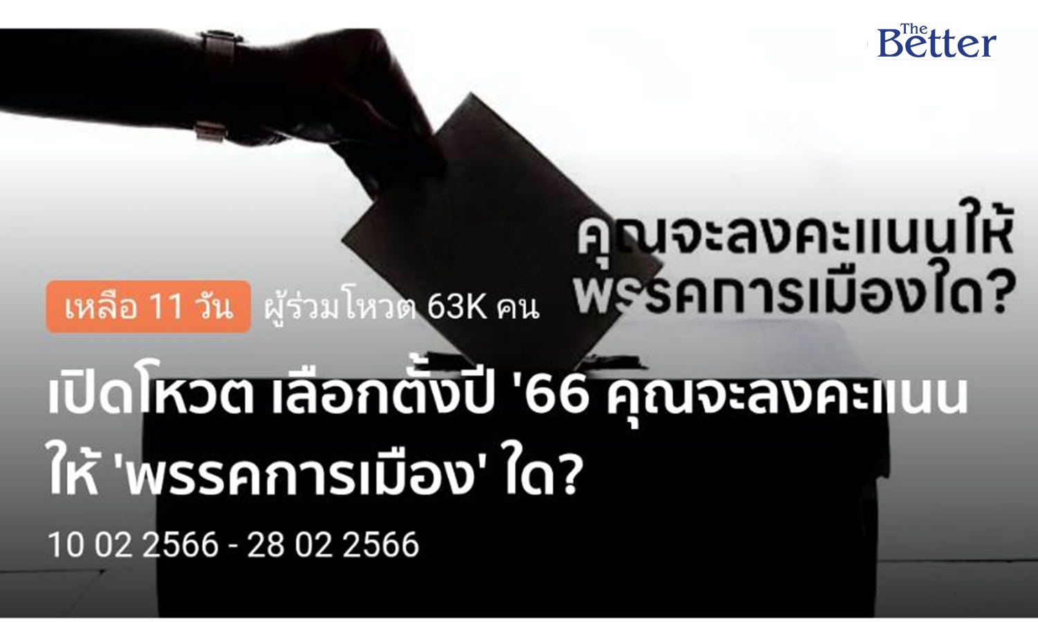 แอปพลิเคชั่น Line Today ทำกิจกรรมแบบสอบถามผ่านแอพพลิเคชั่น ไลน์ทูเดย์ ในห้วข้อ ‘เปิดโหวต เลือกตั้งปี ’66 คุณจะลงคะแนนให้ ‘พรรคการเมือง’ใด ? โดยระบุว่า ใกล้เลือกตั้งปี 2566 คุณจะเลือกลงคะแนนให้ ‘พรรคการเมือง’ ใด ? จากการสำรวจ จนถึงวันที่ 17 ก.พ. 2566 เวลา 11.00 น. พบว่า