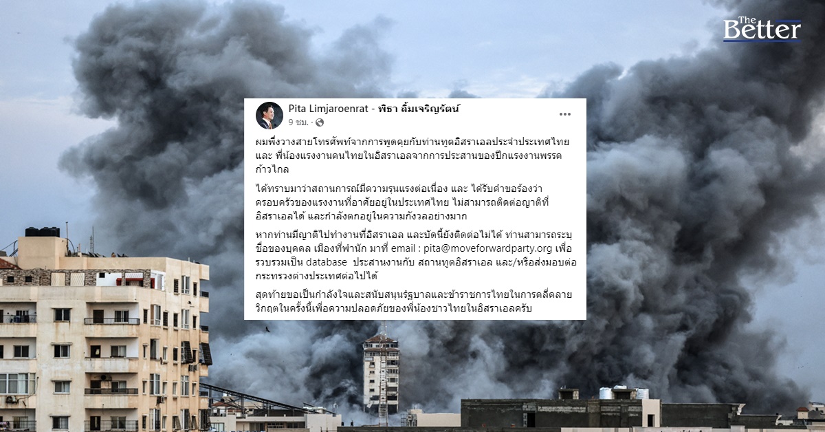 หากท่านมีญาติไปทำงานที่อิสราเอล และบัดนี้ยังติดต่อไม่ได้ ท่านสามารถระบุชื่อของบุคคล เมืองที่พำนัก มาที่ email : pita@moveforwardparty.org เพื่อรวบรวมเป็น database ประสานงานกับ สถานทูตอิสราเอล และ/หรือส่งมอบต่อกระทรวงต่างประเทศต่อไปได้ สุดท้ายขอเป็นกำลังใจและสนับสนุนรัฐบาลและข้าราชการไทย ในการคลี่คลายวิกฤตในครั้งนี้เพื่อความปลอดภัยของพี่น้องชาวไทยในอิสราเอลครับ"