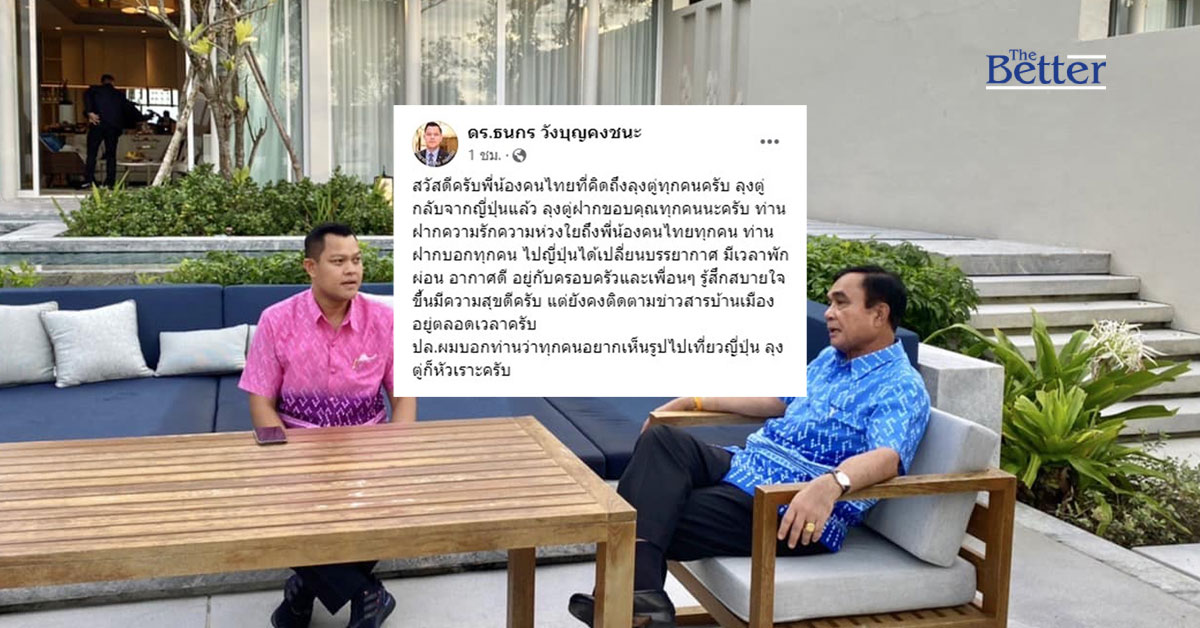 ธนกร เผย "บิ๊กตู่" มีความสุข ได้เปลี่ยนบรรยากาศพาครอบครัว เที่ยวญี่ปุ่นในรอบ 10 ปี หลังวางมืองการเมือง ฝากความห่วงใยถึงพี่น้องคนไทย บอกเจ้าตัวขำหลังเจอแซวอยากเห็นรูปไปเที่ยว
