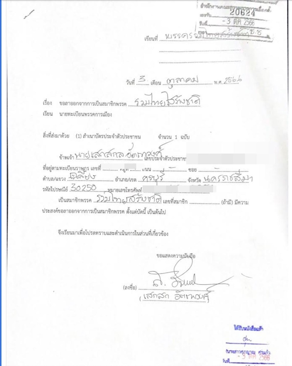 นายเสกสกล อัตถาวงศ์ที่ ปรึกษารองนายกรัฐมนตรี (นายพีระพันธุ์ สาลีรัฐวิภาค) และรองหัวหน้าพรรครวมไทยสร้างชาติ (รทสช.) ได้ยื่นหนังสือลาออกจากสมาชิกพรรครวมไทยสร้างชาติ ต่อคณะกรรมการการเลือกตั้ง (กกต.) ซึ่งเป็นนายทะเบียนพรรคการเมืองแล้ว ตั้งแต่ต้นเดือนตุลาคม 2566