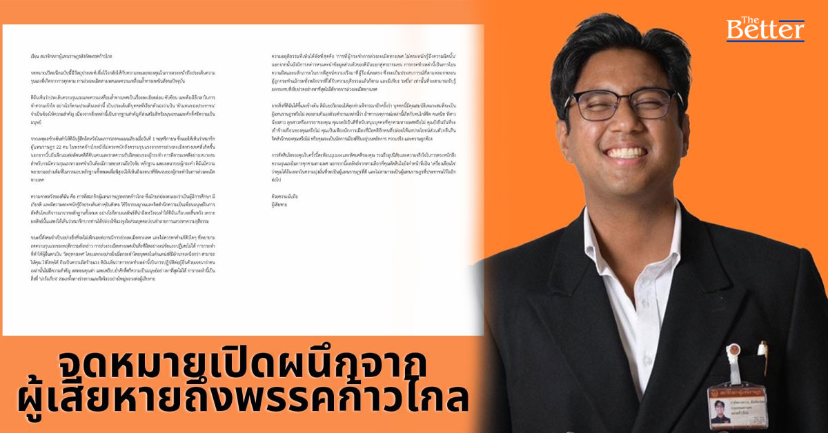 ผู้เสียหายปมคุกคามทางเพศ ผิดหวังมติ "ก้าวไกล" อุ้ม "ปูอัด" ส่งจดหมายเปิดผนึกถึง สส. "พรรคก้าวไกล" ถามถ้าญาติคุณโดน ยังจะสนับสนุนคนคุกคามทางเพศหรือไม่