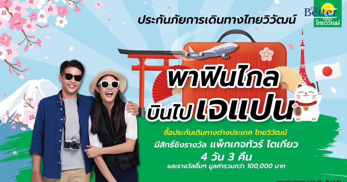 “ประกันภัยไทยวิวัฒน์” หนุนคนไทยเที่ยวต่างแดนอย่างมีหลักประกัน จัดหนักคุ้ม 3 ต่อ ชิงแพ็กเกจทัวร์ญี่ปุ่น 4 วัน 3 คืน"พาฟินไกล บินไปเจแปน" ร่วมกิจกรรม วันนี้ - 29 ก.พ.2567 วัลรวมมูลค่ากว่า 100,000 บาท