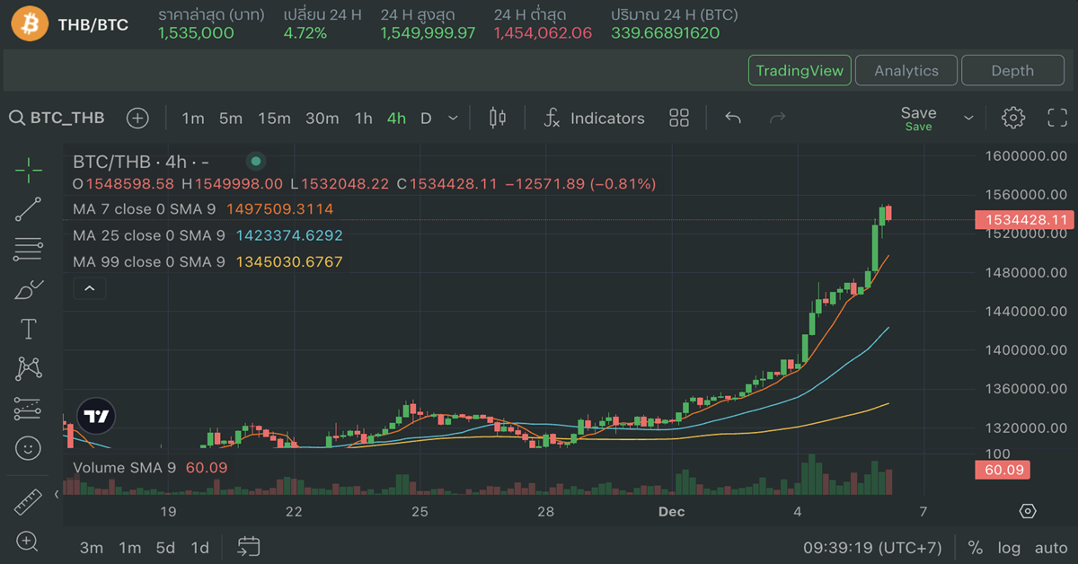 ราคา Bitcoin (BTC) ปรับขึ้นประมาณ 4.68% ในวันที่ 6 ธันวาคม พ.ศ. 2566 แถวระดับ 1,535,000 บาท โดยในภาพรวม 24 ชั่วโมง BTC ทำระดับสูงสุดที่ 1,549,999.97 บาท และต่ำสุดที่ 1,454,062.06 บาท บนกระดานเทรด Bitkub Exchange