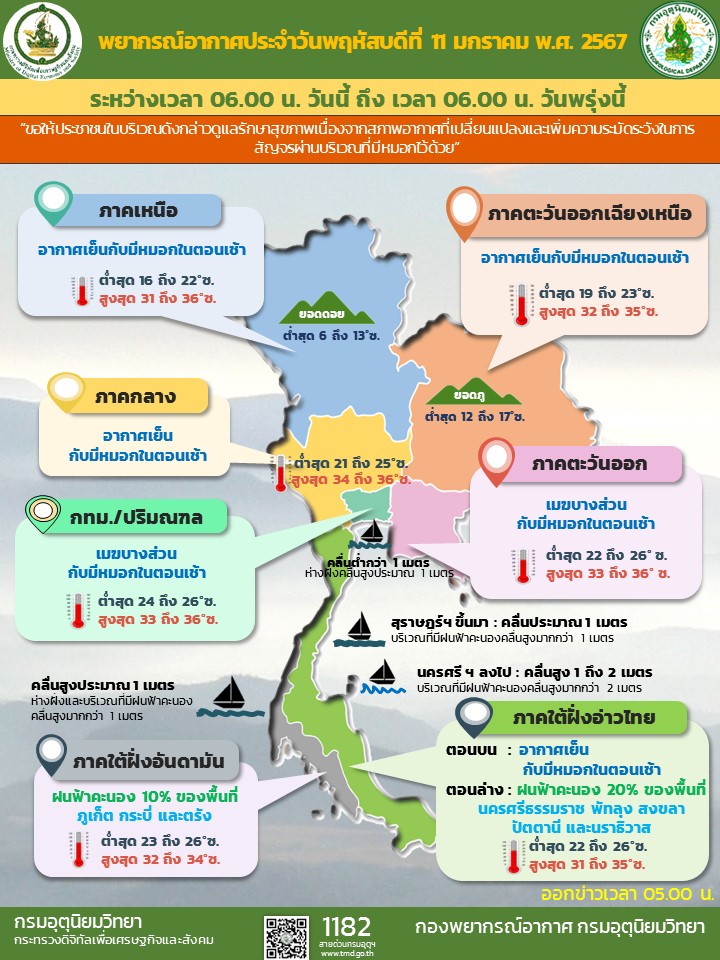 กรมอุตุนิยมวิทยา รายงาน ลักษณะอากาศทั่วไป ประจำวันที่ 11 มกราคม 2567 พยากรณ์อากาศ 24 ชั่วโมงข้างหน้า บริเวณความกดอากาศสูงหรือมวลอากาศเย็นกำลังอ่อนปกคลุมภาคตะวันออกเฉียงเหนือและทะเลจีนใต้ ลักษณะเช่นนี้ทำให้ประเทศไทยตอนบนและภาคใต้ตอนบนมีหมอกในตอนเช้า ส่วนภาคเหนือและภาคตะวันออกเฉียงเหนือยังคงมีอากาศเย็นในตอนเช้า ขอให้ประชาชนในบริเวณดังกล่าวดูแลรักษาสุขภาพเนื่องจากสภาพอากาศที่เปลี่ยนแปลงและเพิ่มความระมัดระวังในการสัญจรผ่านบริเวณที่มีหมอกไว้ด้วย สำหรับมรสุมตะวันออกเฉียงเหนือที่พัดปกคลุมอ่าวไทยและภาคใต้เริ่มมีกำลังอ่อนลง ทำให้ภาคใต้ตอนล่างมีฝนลดลงแต่ยังคงมีฝนฟ้าคะนองบางแห่ง