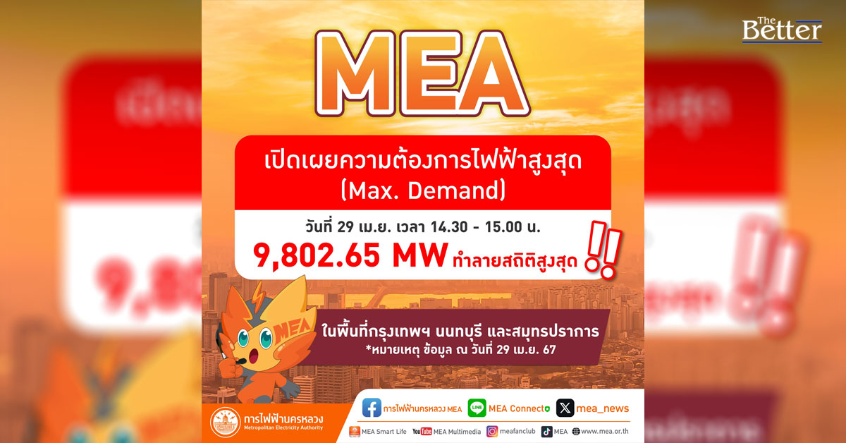 MEA เปิดเผยความต้องการไฟฟ้าสูงสุด (Max. Demand) ปี 67 ที่ 9,802.65 เมกะวัตต์ ทำลายสถิติสูงสุด