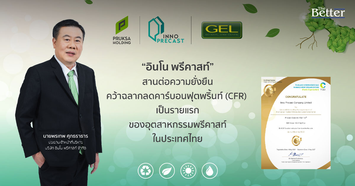 นายพรเทพ ศุภธราธาร ประธานเจ้าหน้าที่บริหาร บริษัท อินโน พรีคาสท์ จำกัด กล่าวว่า อินโน พรีคาสท์ ที่มุ่งมั่นก้าวสู่ Net Zero โดยได้นำเทคโนโลยีคาร์บอนเคียว (CarbonCure) มาใช้ในการผลิตพรีคาสท์คาร์บอนต่ำเป็นรายแรกในวงการอสังหาริมทรัพย์ ด้วยการนำก๊าซคาร์บอนไดออกไซด์ที่รวบรวมจากโรงงานปิโตรเคมีฉีดเข้าไปในขั้นตอนการผสมคอนกรีต ซึ่งก๊าซคาร์บอนไดออกไซด์เป็นหนึ่งในก๊าซเรือนกระจกที่เป็นตัวการทำลายสิ่งแวดล้อม การผลิตแผ่นพรีคาสท์ด้วยเทคโนโลยีคาร์บอนเคียวจึงช่วยลดปัญหาโลกร้อนได้อีกทางหนึ่ง