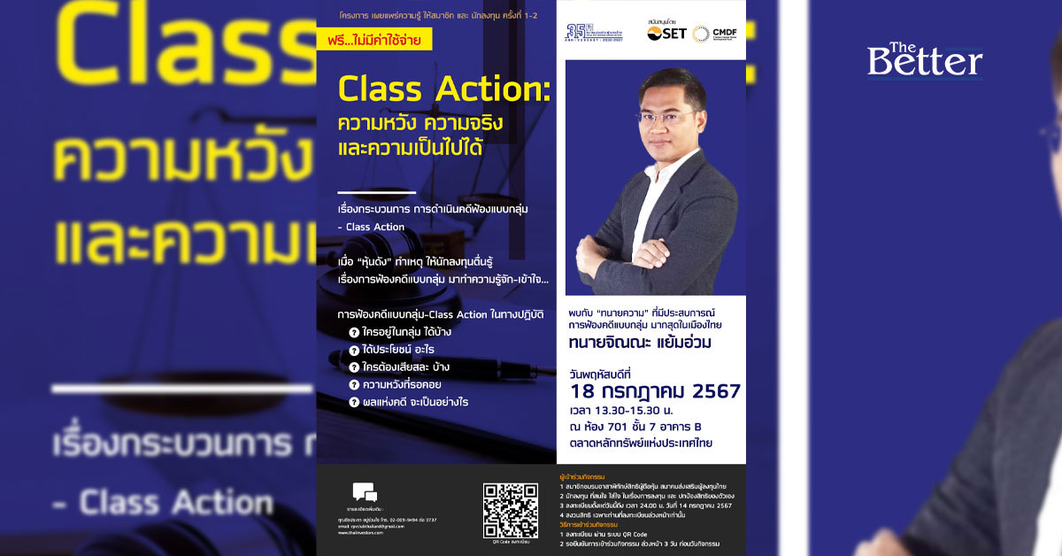 สมาคมส่งเสริมผู้ลงทุนไทย ร่วมกับตลาดหลักทรัพย์แห่งประเทศไทย และกองทุนส่งเสริมพัฒนาตลาดทุน (CMDF) ในการจัดโครงการ “Class Action ความหวัง ความจริง และความเป็นไปได้“ เพื่อเผยแพร่ความรู้ให้สมาชิกและนักลงทุนครั้งที่ 1-2 ซึ่งได้เกียรติจาก ‘ทนายจิณณะ แย้มอ่วม‘ ซึ่งเป็นทนายความที่มากประสบการณ์การฟ้องคดีแบบกลุ่ม มากที่สุดในเมืองไทย