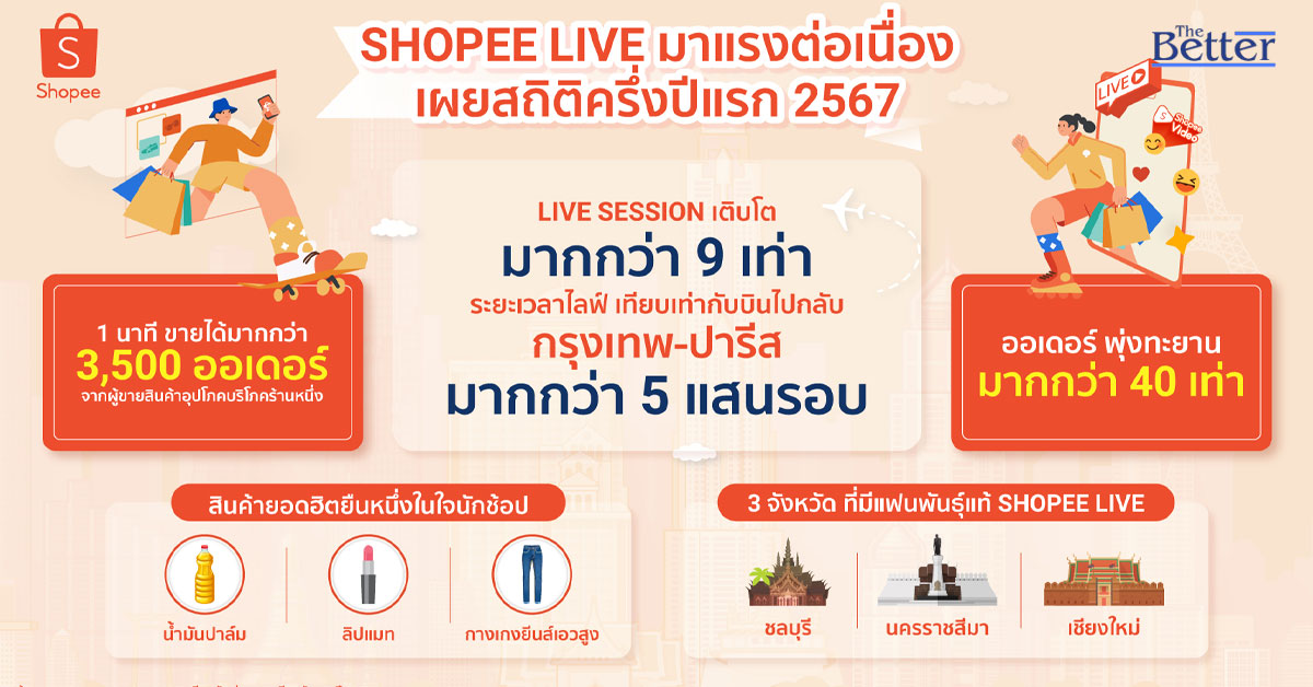 ช้อปปี้ ประเทยไทย เผยสุดยอดสถิติ “Shopee Live” ในช่วงต้นปี 2567 ยอดออเดอร์สินค้าบน Shopee Live พุ่งทะยานมากกว่า 40 เท่า เมื่อเทียบกับช่วงเวลาเดียวกันของปีที่ผ่านมา