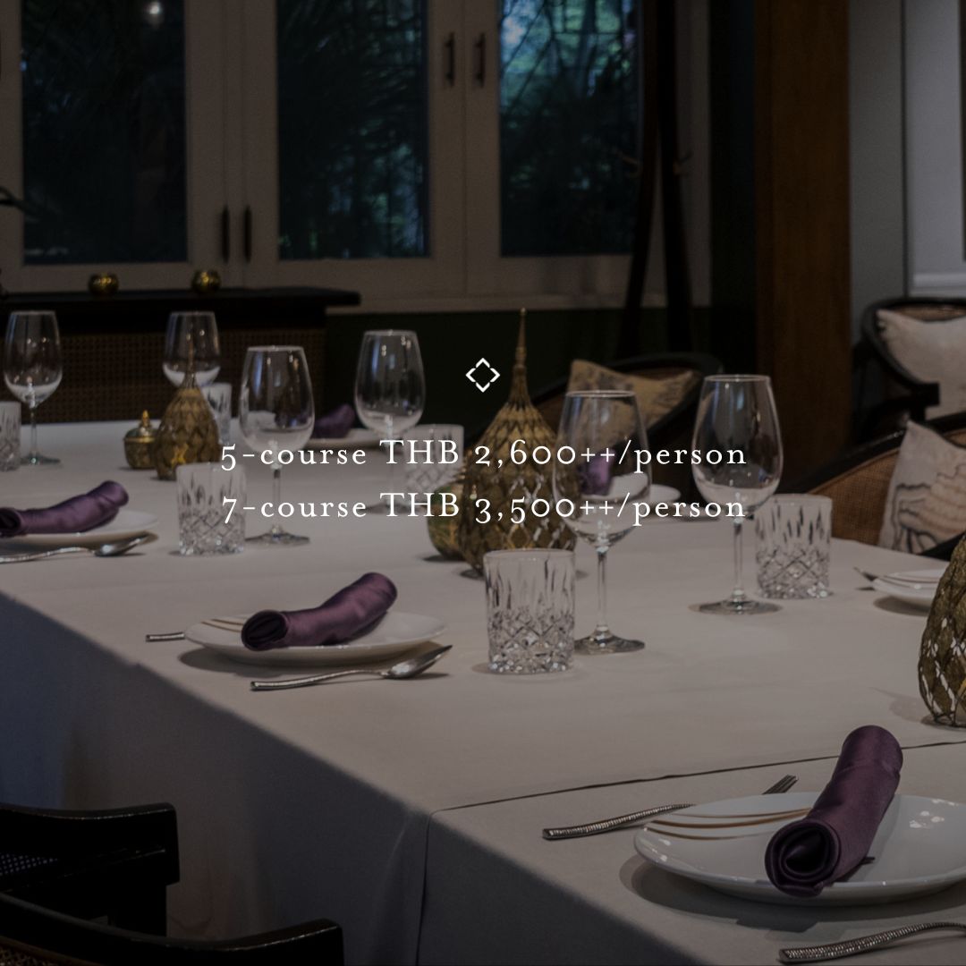 ชุดอาหารไทยเบญจรงค์ 5 คอร์ส พร้อมไวน์แพร์ริ่ง 5 แก้ว ราคา 2,600++ บาทต่อท่าน หรือชุดอาหาร 7 คอร์ส พร้อมไวน์ 6 แก้ว ราคา 3,500++ บาทต่อท่าน เมนู อาทิ ยำมังคุดน้ำตาลเคี่ยวมะพร้าวคั่ว และปลาป่นรมควัน อาหารจานยอดนิยมสูตรเฉพาะของทางร้านเบญจรงค์