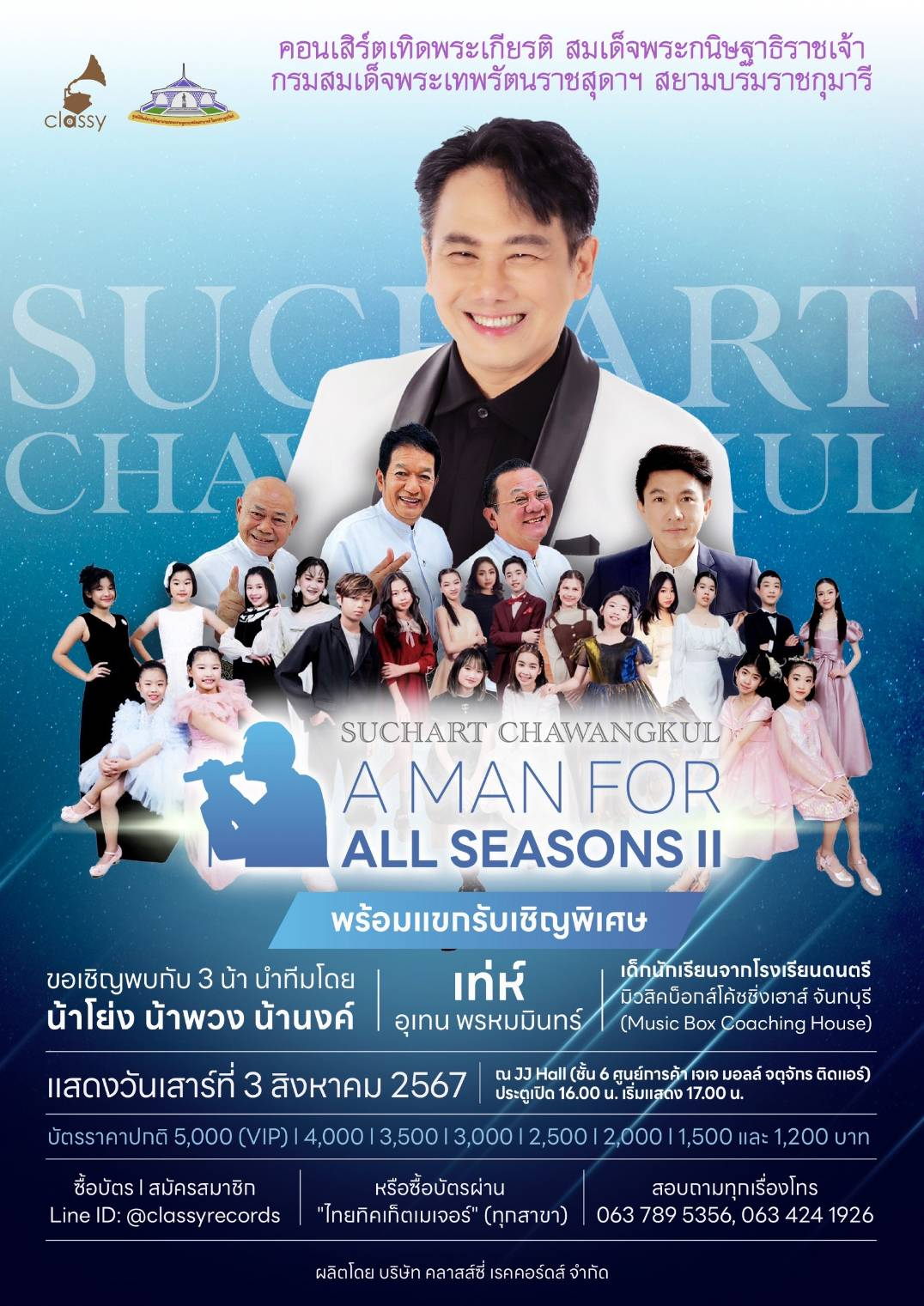 คอนเสิร์ตเทิดพระเกียรติ กรมสมเด็จพระเทพรัตนราชสุดาฯ สยามบรมราชกุมารี Suchart Chawangkul, A Man for all Seasons II จัดแสดงวันเสาร์ที่ 3 สิงหาคม 2567 ประตูเปิด 16.00 น. เริ่มแสดง 17.00 น. ที่ เจเจ ฮอลล์(JJ Hall) ชั้น 6 ศูนย์การค้า เจเจ มอลล์ จตุจักร บัตรราคา 5,000 (VIP) , 4,000 , 3,500 , 3,000 , 2,500 , 2,000 , 1,500 และ 1,200 บาท ซื้อบัตรได้ที่ Line ID: @classyrecords หรือไทยทิคเก็ตเมเจอร์ (ทุกสาขา) สอบถามรายละเอียดได้ที่ 063 789 5356, 063 424 1926