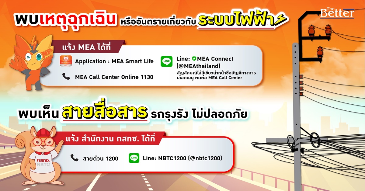 หากพบเหตุผิดปกติ ฉุกเฉิน หรืออันตรายเกี่ยวกับระบบไฟฟ้าในพื้นที่กรุงเทพมหานคร นนทบุรี และสมุทรปราการ แจ้ง MEA หรือการไฟฟ้านครหลวง ได้ที่