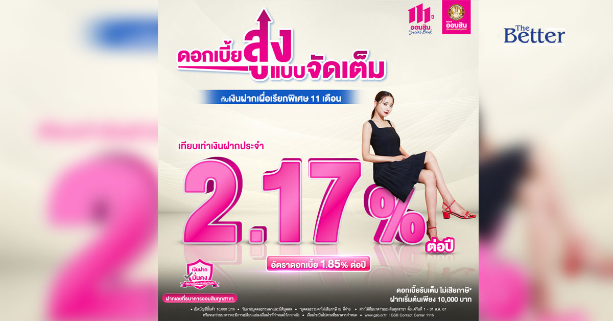 ออมสินเอาใจสายออมให้ได้เฮกันต่อ กับเงินฝากดอกเบี้ยสูง รับเต็มไม่เสียภาษี 11 เดือน รับดอกเบี้ยสูง 1.85% ต่อปี ตั้งแต่ 1-31 ส.ค. 67