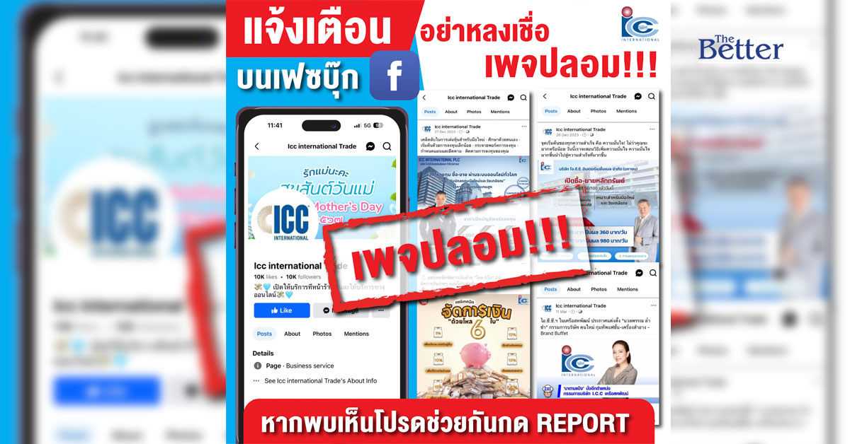บริษัท ไอ.ซี.ซี. อินเตอร์เนชั่นแนล จำกัด (มหาชน) หรือ ICC เปิดเผยว่า ขณะนี้ได้ตรวจพบผู้ไม่ประสงค์ดีแอบอ้างนำชื่อบริษัท ฯ โลโก้ของ ICC และรูปผู้บริหาร สร้างเฟซบุ๊กปลอม เพื่อทำการหลอกลวงชักชวนร่วมลงทุน โดยการเปิดบัญชีพอร์ตลงทุน ซื้อ-ขาย ผ่านช่องทางออนไลน์ ให้ผลตอบแทนสูงในระยะเวลาสั้น โดยล่าสุดตรวจพบเพจที่มีลักษณะเข้าข่ายมิจฉาชีพ ได้แก่ Icc international Trade : https://www.facebook.com/share/gRMpKMmmCh1DQCTe/?mibextid=LQQJ4d