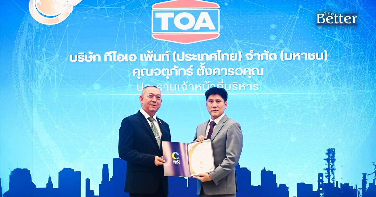 บริษัท ทีโอเอ เพ้นท์ (ประเทศไทย) จำกัด (มหาชน) หรือ TOA โดย นายจตุภัทร์ ตั้งคารวคุณ ประธานเจ้าหน้าที่บริหาร เข้ารับประกาศนียบัตร "เครื่องหมายรับรองลดคาร์บอนฟุต พริ้นท์ของผลิตภัณฑ์ (Carbon Footprint Reduction: CFR)" หรือ “ฉลากลดโลกร้อน” ที่ผ่านการรับรองมากที่สุดถึง 133 ผลิตภัณฑ์จากองค์การบริหารจัดการก๊าซเรือนกระจก (องค์การมหาชน) หรือ TGO โดยมี ดร.เฉลิมชัย ศรีอ่อน รัฐมนตรีว่าการกระทรวงทรัพยากรธรรมชาติและสิ่งแวดล้อม เป็นประธานในพิธี ณ สถาบันเพื่อการยุติธรรมแห่งประเทศไทย (องค์การมหาชน) ถ.แจ้งวัฒนะ