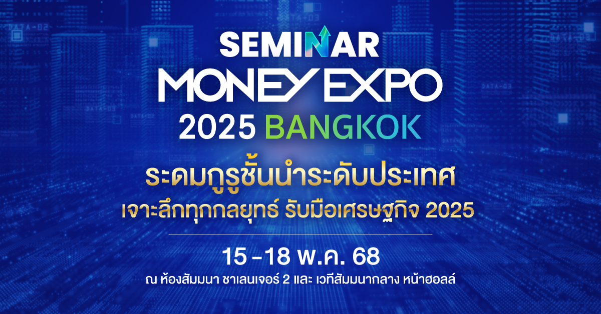 งานมหกรรมการเงินกรุงเทพ ครั้งที่ 25 MONEY EXPO 2025 BANGKOK จัดสัมมนาสุดเข้มข้น ระดมกูรูผู้เชี่ยวชาญด้านการเงินการลงทุน นักวิเคราะห์ระดับประเทศ เสิร์ฟความรู้แบบเจาะลึกทุกประเด็น เพื่อให้ก้าวทันการเปลี่ยนแปลงของเศรษฐกิจในปี 2025 ตอบโจทย์ทุกสายการลงทุนทั้งมือใหม่และมือโปร เข้าร่วมงานฟรี วันที่ 15-18 พฤษภาคม 2568 ณ เวทีสัมมนากลาง และห้องสัมมนา อาคารชาเลนเจอร์ 2-3 อิมแพ็ค เมืองทองธานี