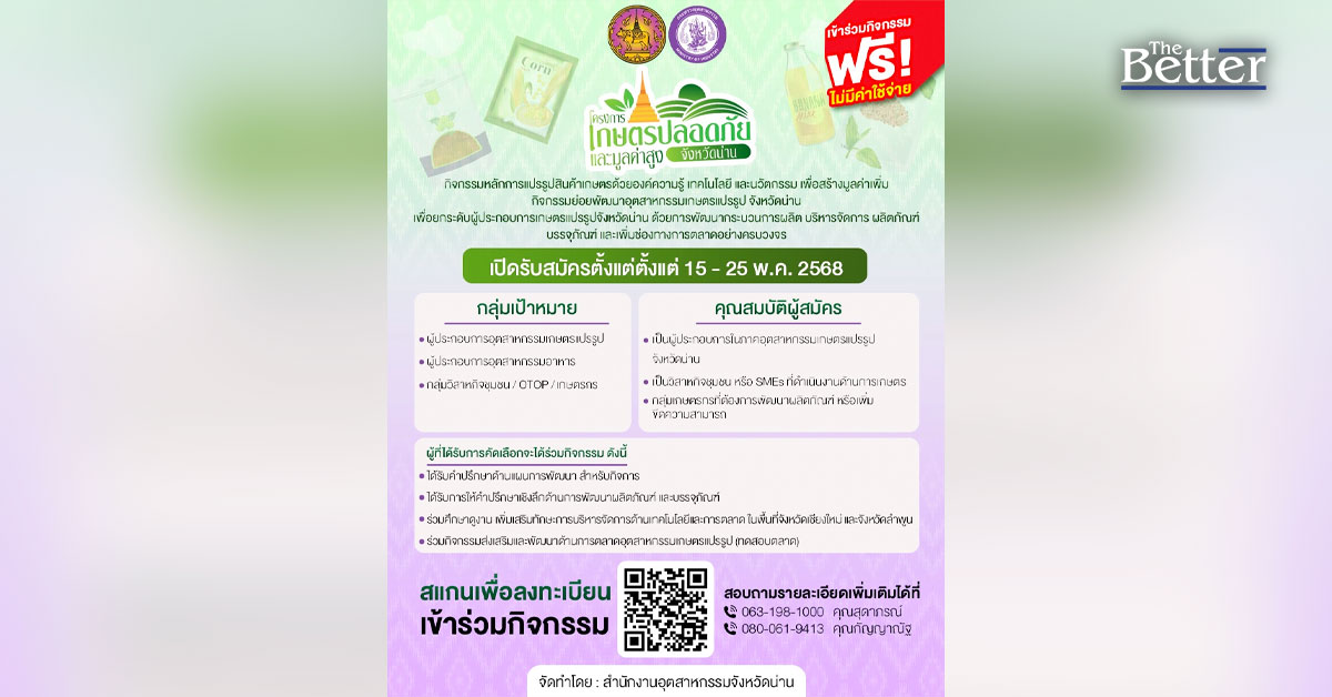 เชิญชวนผู้ประกอบการเข้าร่วม โครงการเกษตรปลอดภัยและมูลค่าสูง กิจกรรมหลักการแปรรูปสินค้าเกษตรด้วยองค์ความรู้ เทคโนโลยี และนวัตกรรม เพื่อสร้างมูลค่าเพิ่ม กิจกรรมย่อยพัฒนาอุตสาหกรรมเกษตรแปรรูปจังหวัดน่าน ประจำปีงบประมาณ พ.ศ.2568 โดยสำนักงานอุตสาหกรรมจังหวัดน่าน
