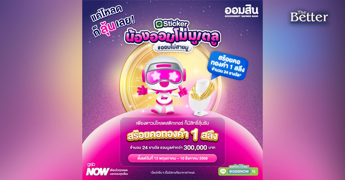 พิเศษ!! ทุกการดาวน์โหลดสติกเกอร์ไลน์ชุด "GSB NOW x น้องออมโม่มูเตลู" จะมีสิทธิ์ลุ้นรับรางวัล สร้อยคอทองคำ 1 สลึง จำนวน 24 รางวัล มูลค่ารวมกว่า 300,000 บาท * ติดตามประกาศผลผู้โชคดีผ่านช่องทาง LINE GSB NOW