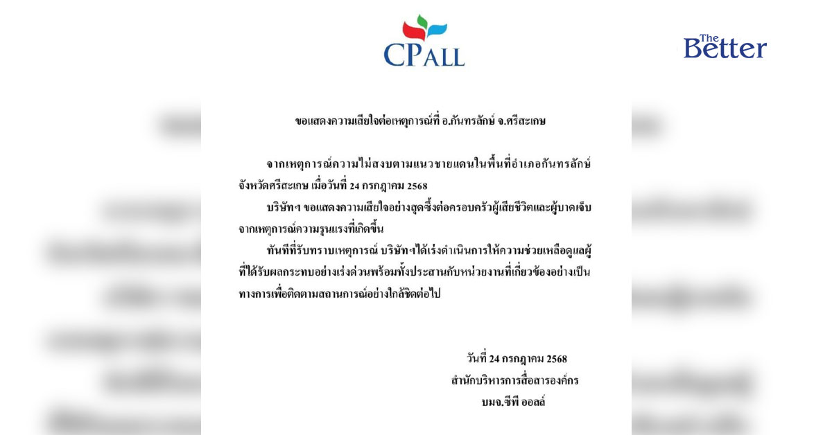 ทาง CPALL ได้ออกมาแสดงความเสียใจต่อเหตุการณ์ที่ จ.ศรีสะเกษ