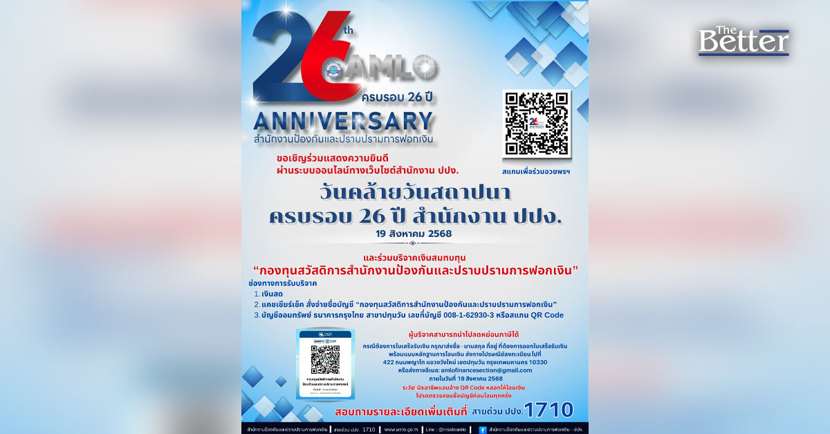 ในโอกาสวันคล้ายวันสถาปนาครบรอบ 26 ปี สำนักงานป้องกันและปราบปรามการฟอกเงิน 19 สิงหาคม 2568 นี้ จึงขอเชิญชวนทุกท่านร่วมแสดงความยินดีผ่านระบบออนไลน์ของเว็ปไซต์สำนักงาน ปปง. และร่วมบริจาคเงินสมทบทุน "กองทุนสวัสดิการสำนักงานป้องกันและปราบปรามการฟอกเงิน" โดยบริจาคผ่านบัญชีออมทรัพย์ ธนาคารกรุงไทย สาขาปทุมวัน เลขที่บัญชี 008-1-62930-3 ผู้บริจาคสามารถนำไปลดหย่อนภาษีได้ สอบถามรายละเอียดเพิ่มเติมที่ สายด่วน ปปง.1710