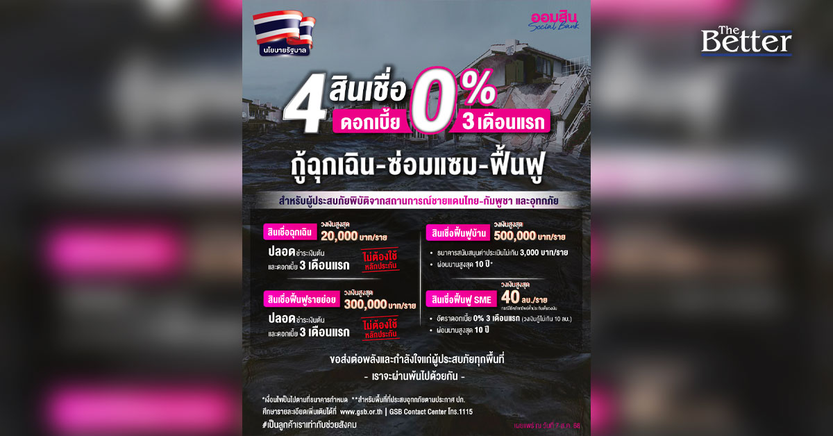 ออมสิน เร่งเพิ่มสภาพคล่องด้วย 4 สินเชื่อพิเศษ ดอกเบี้ย 0% นาน 3 เดือนแรก เยียวยาเหตุชายแดน-น้ำท่วม ขานรับนโยบายรัฐ เคียงข้างคนไทยทุกวิกฤต