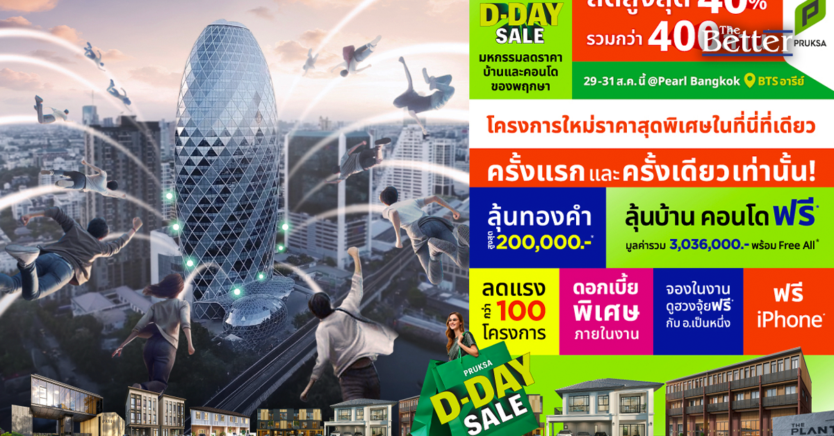 ดีลสุดคุ้มแบบนี้มีเฉพาะที่งาน PRUKSA D-DAY SALE เท่านั้น ผู้สนใจเข้าร่วมงานได้ในวันที่ 29–31 สิงหาคม 2568 เวลา 10.00-19.00 น. ที่อาคารเพิร์ล แบงก์ค็อก อารีย์ เดินทางสะดวกใกล้รถไฟฟ้า BTS สถานีอารีย์ (ทางออก 1) สามารถติดตามข้อมูลข่าวสารและสิทธิพิเศษต่าง ๆ เพิ่มเติมได้ที่ Line Official: @PRUKSA เพจเฟซบุ๊ค Pruksa Family Club และศึกษารายละเอียดเงื่อนไขเพิ่มเติมได้ที่เว็บไซต์ https://www.pruksa.com/p/ddaysale หรือ โทร.1739