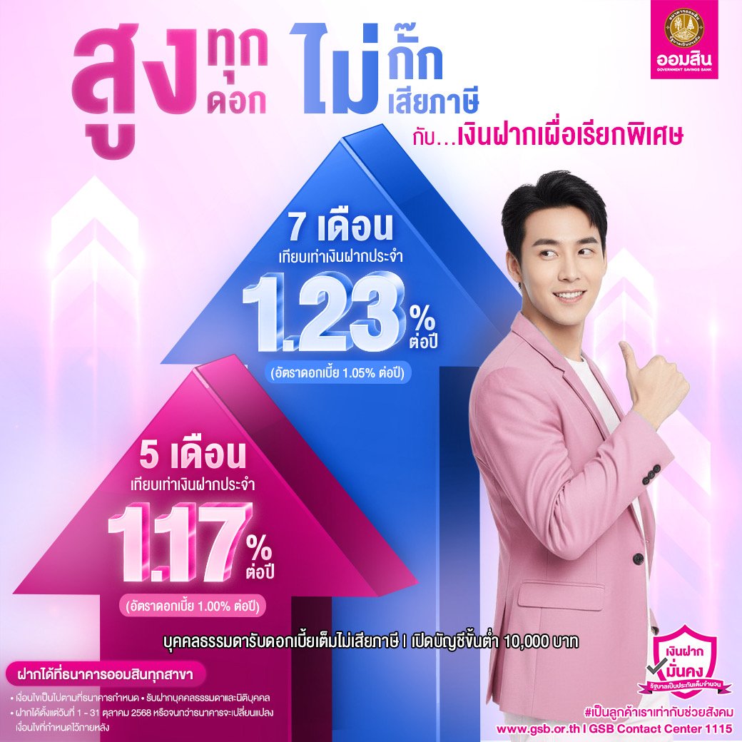 ฝากได้ตั้งแต่วันที่ 1 - 31 ตุลาคม 2568 ที่ธนาคารออมสินทุกสาขา