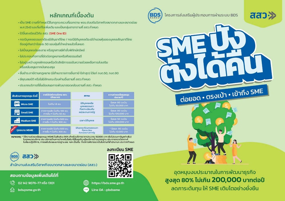 สำนักงานส่งเสริมวิสาหกิจขนาดกลางและขนาดย่อม (สสว.) เผยความสำเร็จในปีที่ผ่านมา มีการตอบรับจากผู้ประกอบการเข้าร่วมโครงการส่งเสริมผู้ประกอบการผ่านระบบ BDS (Business Development Service) (SME ปัง ตังได้คืน) มากกว่า 22,000 ราย สามารถสนับสนุนผู้ประกอบการที่เข้าร่วมโครงการฯ สร้างมูลค่าเศรษฐกิจได้ถึง 6,000 ล้านบาท ตั้งเป้าปีหน้าเพิ่มการให้บริการ ส่งเสริม SME กว่า 3,000 ราย มุ่งเน้น ด้าน ธุรกิจ Health & Wellness ธุรกิจ Creative & Lifestyle Business กลุ่มกรีนบิสซิเนส เปิดกว้างให้เอกชนเข้าร่วม