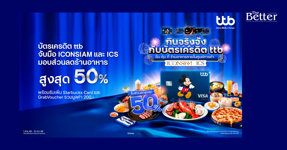 ใช้บัตรเครดิต ttb อิ่มที่ ICONSIAM และ ICS รับส่วนลดสูงสุด 50% พร้อมรับ Starbucks Card และ Grab Voucher รวม 200 บาท เมื่อใช้จ่ายครบ 1,200 บาทขึ้นไป ตั้งแต่ 1 พ.ย. – 31 ธ.ค. 2568