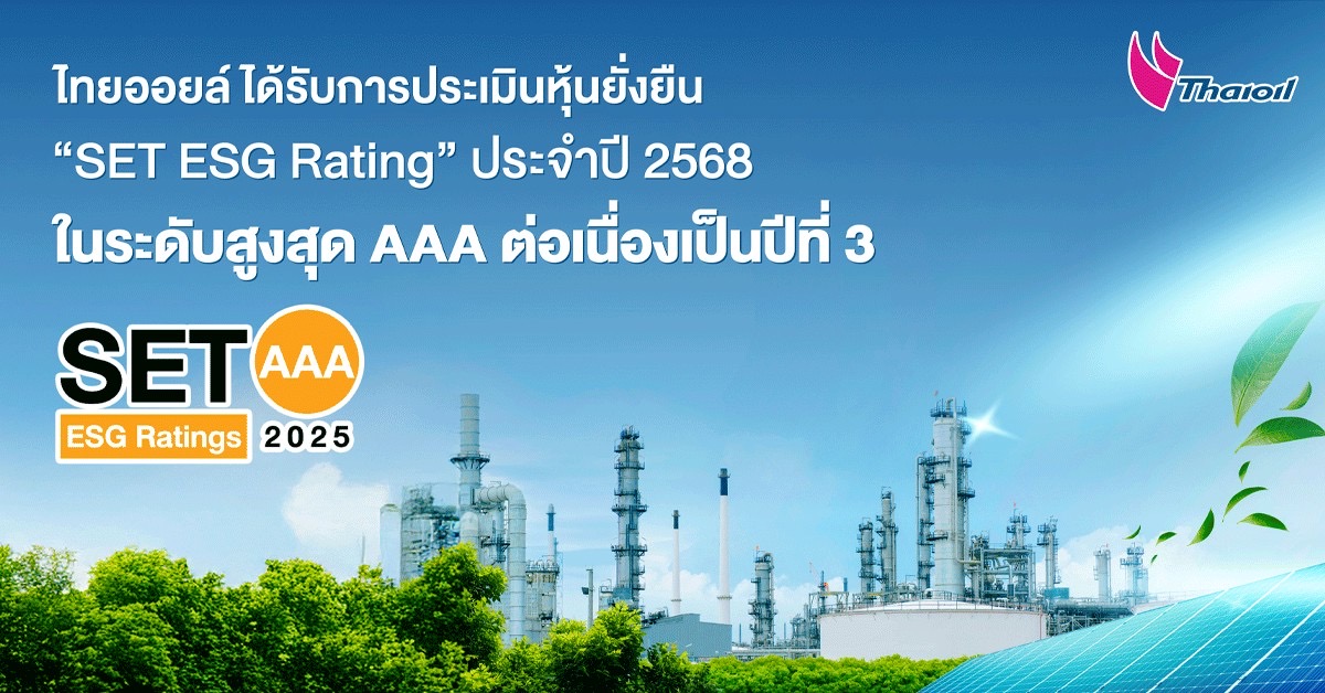 ไทยออยล์ ได้รับการประเมินหุ้นยั่งยืน SET ESG Rating ประจำปี 2568 ในระดับสูงสุด AAA ต่อเนื่องเป็นปีที่ 3