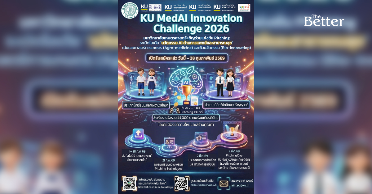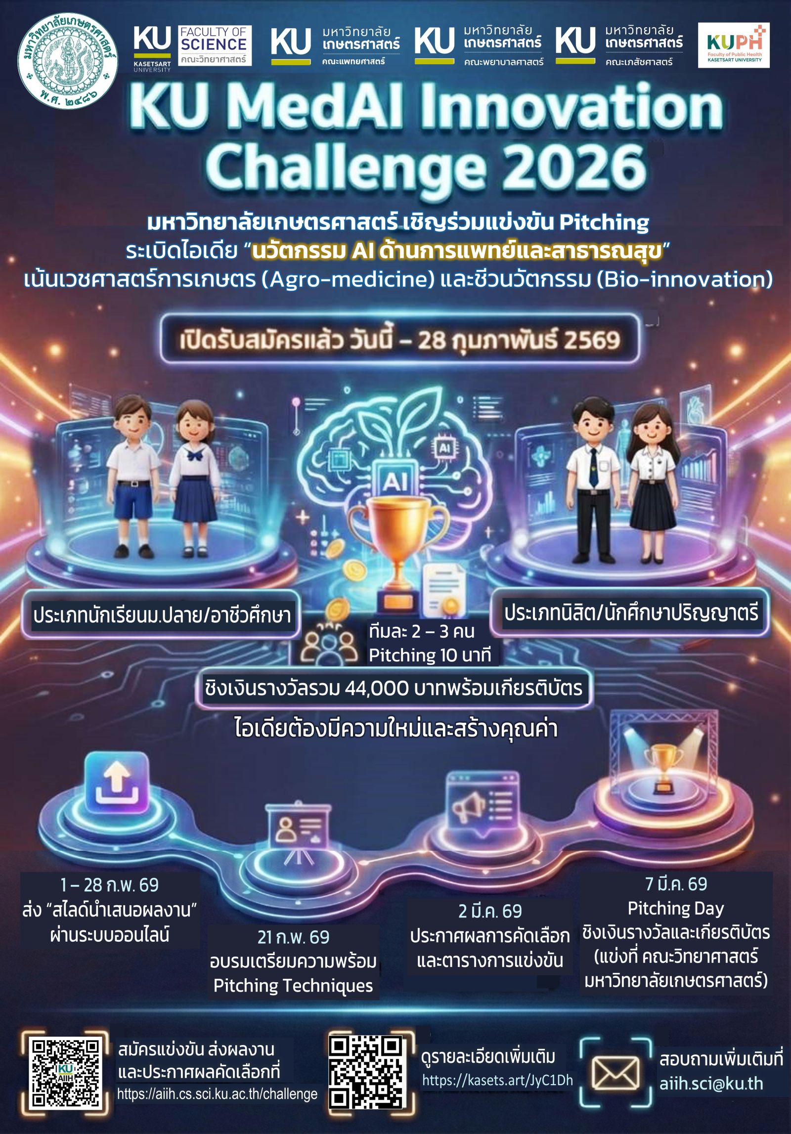 มหาวิทยาลัยเกษตรศาสตร์ (มก.) ขับเคลื่อนครั้งสำคัญสู่การเป็นศูนย์กลางนวัตกรรมการแพทย์ระดับประเทศ เปิดตัวโครงการแข่งขัน "KU MedAI Innovation Challenge 2026" ภายใต้ธีม “Beyond Boundaries: Advancing Medicine and Public Health Through AI Innovation”ชวนนักเรียน ม.ปลาย อาชีวะ และนิสิตนักศึกษาทั่วประเทศ ร่วมประชันไอเดีย AI พลิกโฉมวงการสุขภาพ