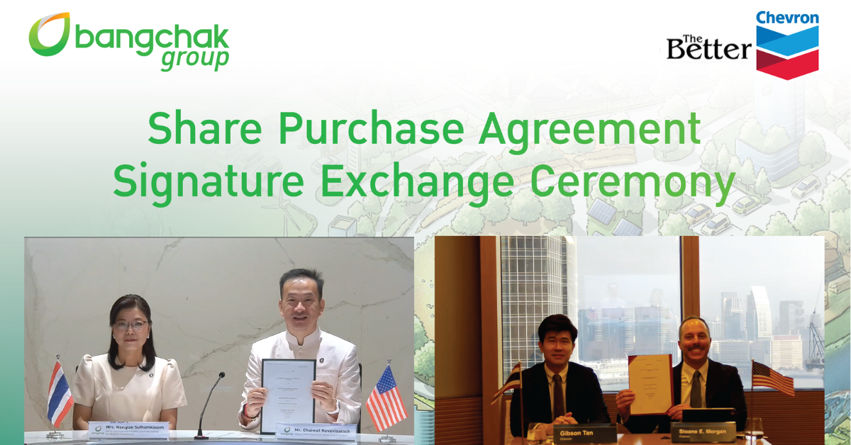 บริษัท บางจาก คอร์ปอเรชั่น จำกัด (มหาชน) ลงนามในสัญญาซื้อขายหุ้นกับบริษัท Chevron Companies (Greater China) Limited (“CCGC”) เพื่อเข้าถือหุ้นกิจการบริษัท Chevron Hong Kong Limited (“CHK”) ในสัดส่วน ร้อยละ 100 โดยมีนายชัยวัฒน์ โควาวิสารัช ประธานเจ้าหน้าที่บริหารกลุ่มบริษัทบางจาก และกรรมการผู้จัดการใหญ่ บริษัท บางจาก คอร์ปอเรชั่น จำกัด (มหาชน) เป็นผู้ลงนามในพิธีลงนามแบบออนไลน์ ร่วมกับ CCGC นับเป็นก้าวสำคัญของบางจากฯ ในการขยายธุรกิจพลังงานไทยสู่ตลาดต่างประเทศและการเตรียมความพร้อมด้านตลาดสำหรับธุรกิจโรงกลั่นน้ำมันในประเทศไทย โดยเฉพาะอย่างยิ่งการบริหารกำลังการกลั่นของกลุ่มบริษัทบางจากในระยะยาว