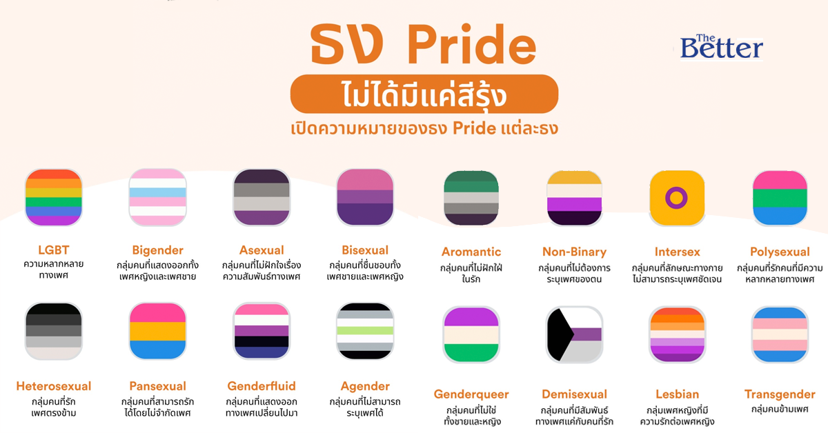 หากมีโอกาสได้เข้าไปเป็นส่วนหนึ่งหรือได้ร่วมส่งเสียงเชียร์ในขบวนพาเหรดเพื่อร่วมเฉลิมฉลอง Pride Month สิ่งหนึ่งที่เป็นสัญลักษณ์และเป็นตัวแทนของความหลากหลายทางเพศ ก็คือ ธงที่แต่ละคนโบกสะบัด เพื่อบ่งบอกถึงความภาคภูมิใจของตน การยอมรับในตัวเอง สนับสนุนสิทธิเสรีภาพ ความมีเกียรติ ความเท่าเทียม และการสร้างการรับรู้ต่อบุคคลในสังคม แต่คุณรู้หรือไม่ว่า ธง Pride ที่เราเห็นกันทุกวันนี้ ไม่ได้มีเพียงแค่สีรุ้งเท่านั้น แต่ยังมีอีกหลายสีหลายแบบหลายดีไซน์ให้เราได้เรียนรู้ ซึ่งธงแต่ละแบบถูกพัฒนาขึ้นมาโดยกลุ่มคอมมูนิตี้ย่อยๆ* ในวันนี้ที่ FWD ประกันชีวิต พาทุกคนมาทำความรู้จักเป็นเพียงแค่บางส่วนเท่านั้น เพราะจริงๆ แล้ว ยังมีธงที่เป็นตัวแทนความหลากหลายของกลุ่มอื่นๆ อีกมากมาย เช่นเดียวกับความสวยงามและความหลากหลายของสีสันบนโลกใบนี้ (All Colors are Beautiful.)