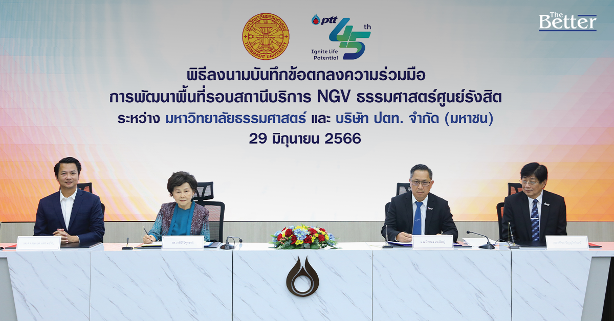 รองศาสตราจารย์เกศินี วิฑูรชาติ อธิการบดี มหาวิทยาลัยธรรมศาสตร์ และ หม่อมหลวงปีกทอง ทองใหญ่ รองกรรมการผู้จัดการใหญ่หน่วยธุรกิจก๊าซธรรมชาติ บริษัท ปตท. จำกัด (มหาชน) (ปตท.) พร้อมด้วยผู้บริหารจากมหาวิทยาลัยธรรมศาสตร์ และ ปตท. ร่วมพิธีลงนามบันทึกข้อตกลงความร่วมมือการพัฒนาพื้นที่รอบสถานีบริการ NGV ธรรมศาสตร์ศูนย์รังสิต สู่แหล่งรวมบริการที่หลากหลายทั้งด้านพลังงานในอนาคต ศูนย์รวมสินค้าและบริการที่ตรงกับไลฟ์สไตล์คนรุ่นใหม่ที่สะดวกสบายเข้าถึงได้ง่าย ภายใต้แนวคิด “Greenity+” ในรูปแบบการผสมผสานการใช้งานพื้นที่ให้เป็นแหล่งเรียนรู้ด้านสิ่งแวดล้อม พลังงานสะอาด และการให้บริการและสินค้าที่ตอบโจทย์ผู้ใช้งานในพื้นที่ (Mixed Used Station)
