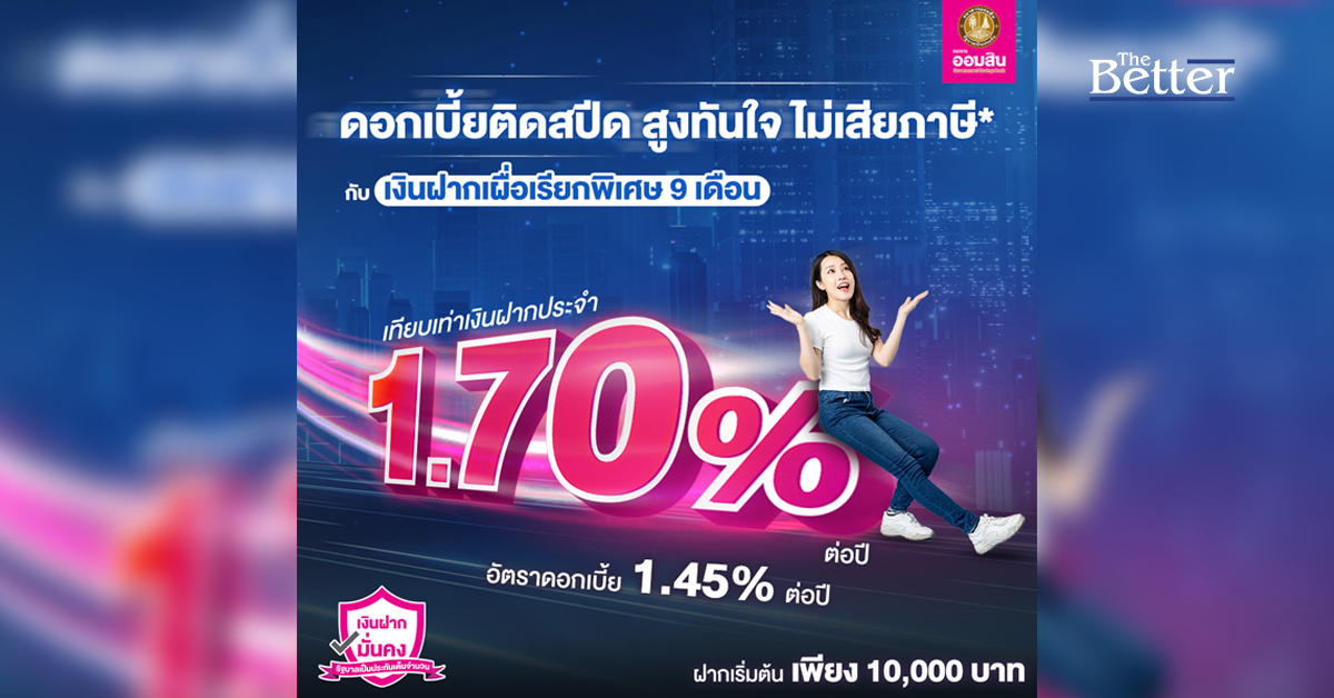 ธนาคารออมสิน ส่งเสริมการออม ออกแคมเปญใหม่ เงินฝากเผื่อเรียกพิเศษ 9 เดือน รับดอกเบี้ยสูง 1.45% ต่อปี ผลตอบแทนไว ไม่เสียภาษี