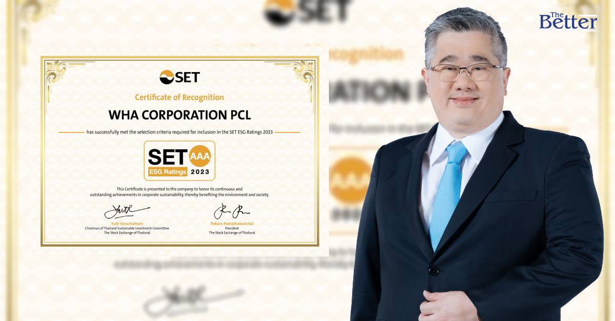 WHA GROUP ได้รับผลการประเมิน SET ESG Ratings ปี 2566 สูงสุดที่ระดับ “AAA” ติดรายชื่อหุ้นยั่งยืนต่อเนื่องเป็นปีที่ 4 ตอกย้ำการพัฒนาธุรกิจเพื่อเติบโตอย่างยั่งยืน สู่การสร้างอนาคตที่ดีให้กับสังคมและประเ