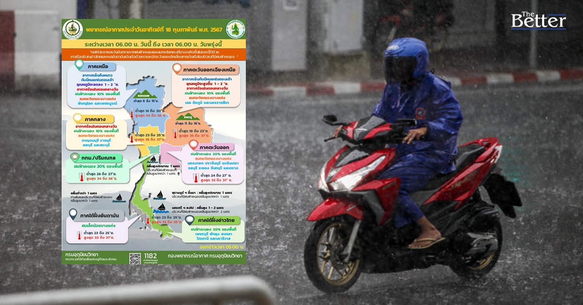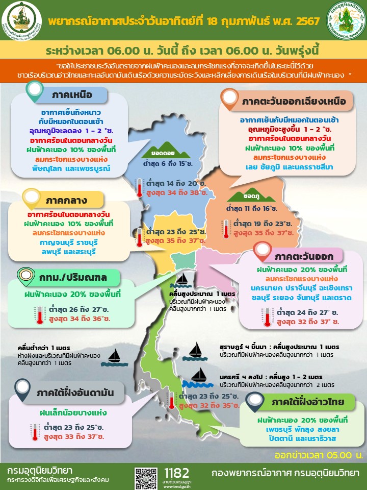 กรมอุตุนิยมวิทยา รายงาน ลักษณะอากาศทั่วไป ประจำวันที่ 18 กุมภาพันธ์ 2567 พยากรณ์อากาศ 24 ชั่วโมงข้างหน้า คลื่นกระแสลมฝ่ายตะวันตกจากประเทศเมียนมาเคลื่อนเข้าปกคลุมภาคเหนือ ประกอบกับมีลมใต้และลมตะวันออกเฉียงใต้พัดปกคลุมภาคตะวันออกเฉียงเหนือตอนล่าง ภาคกลาง รวมทั้งกรุงเทพมหานครและปริมณฑล และภาคตะวันออก ลักษณะเช่นนี้ทำให้บริเวณดังกล่าวมีฝนฟ้าคะนองกับมีลมกระโชกแรงเกิดขึ้นได้บางพื้นที่ ขอให้ประชาชนระวังอันตรายจากฝนฟ้าคะนองและลมกระโชกแรงที่อาจจะเกิดขึ้นในระยะนี้ไว้ด้วย