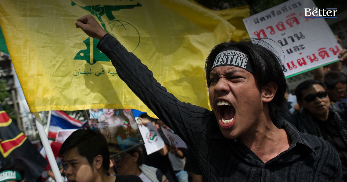 ภาพประกอบข่าว - ผู้สนับสนุนชาวปาเลสไตน์ถือป้ายและตะโกนคำขวัญเรียกร้องให้ยุติความรุนแรงในฉนวนกาซาระหว่างการชุมนุมหน้าสถานทูตอิสราเอลในกรุงเทพฯ ระหว่างขบวนพาเหรดเนื่องในวันอัลกุดส์สากล เมื่อวันที่ 25 กรกฎาคม 2014 ทั้งนี้ วันอัลกุดส์สากล เป็นโครงการริเริ่มที่เริ่มต้นโดยผู้นำการปฏิวัติอิหร่าน อายะตุลลอฮ์ โคมัยนี จัดขึ้นทุกปีในวันศุกร์สุดท้ายของเดือนรอมฎอน เพื่อเรียกร้องให้คืนนครเยรูซาเล็มกลับไปอยู่ในการครอบครองของชาวปาเลสไตน์ (ภาพโดย NICOLAS ASFOURI / AFP)