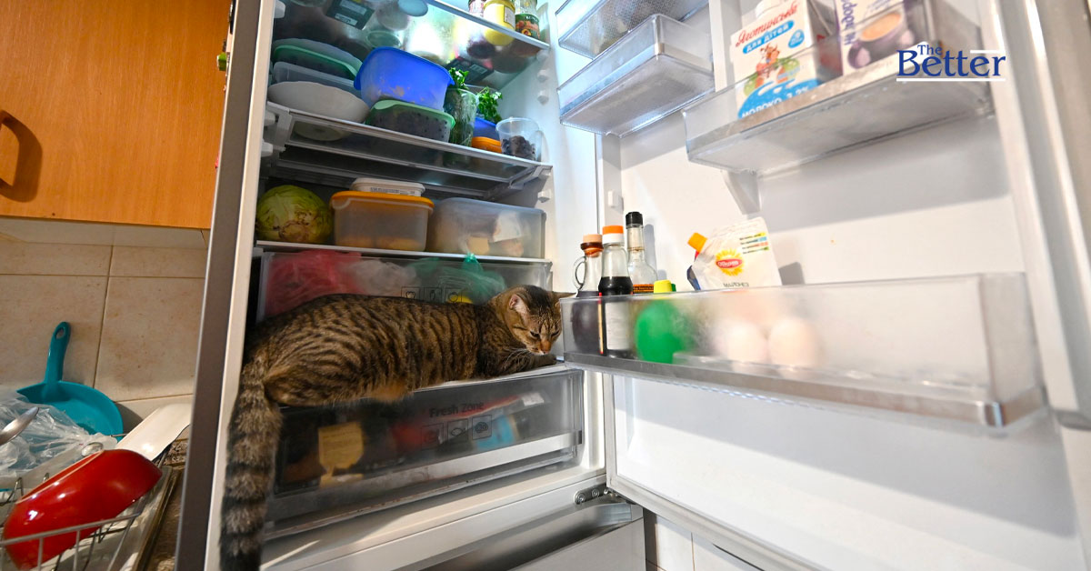 ภาพประกอบข่าว - แมวตัวหนึ่งนอนอยู่ในตู้เย็นในแฟลตของเจ้าของมัน เพื่อคลายร้อนในช่วงคลื่นความร้อนในกรุงเคียฟ เมืองหลวงของยูเครน เมื่อวันที่ 16 กรกฎาคม 2021 (ภาพโดย Sergei SUPINSKY / AFP)